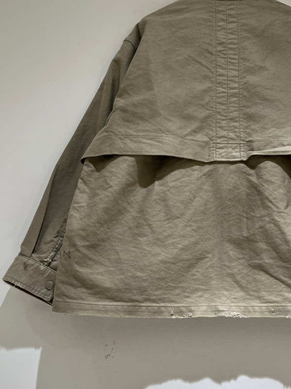 大きく取られた背面ヨークの生地や斜めのフラップなど、ハンティングジャケット、フィールドジャケットのようなディテールも取り入れられています。