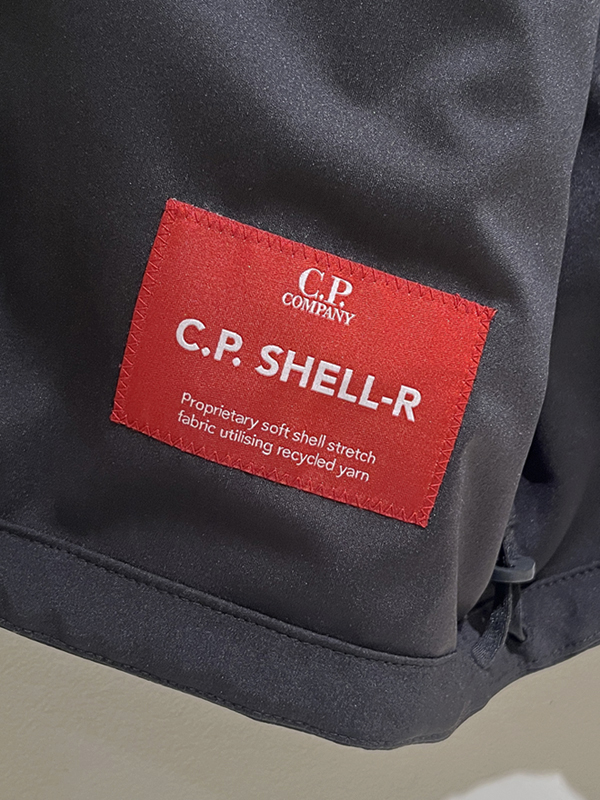 マットな質感のブラックボディ、表地は再生ナイロン糸を使用した独自のソフトシェル「C.P.SHELL-R(CPシェルR)」(ポリエステル92%×ポリウレタン8%)、ライニングはポリアミド100%です。