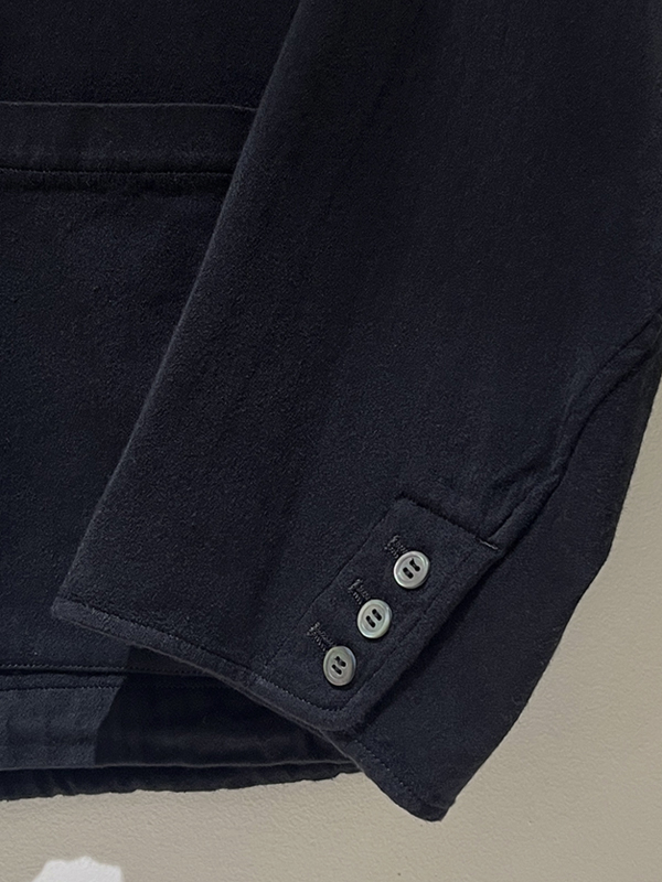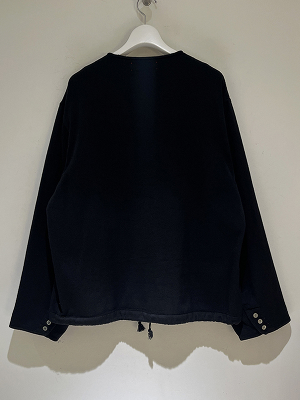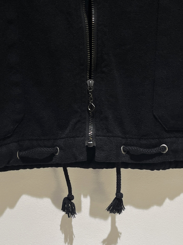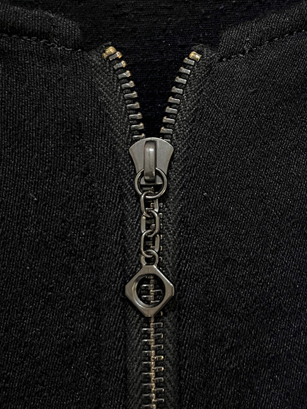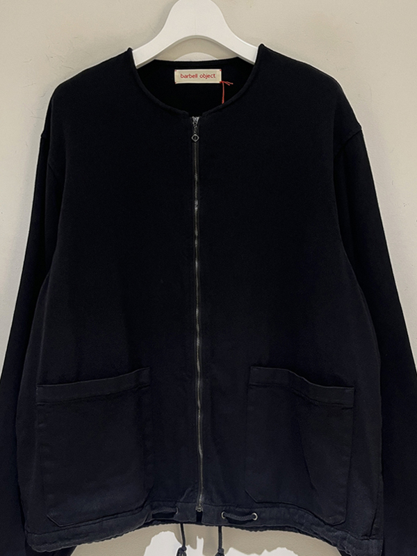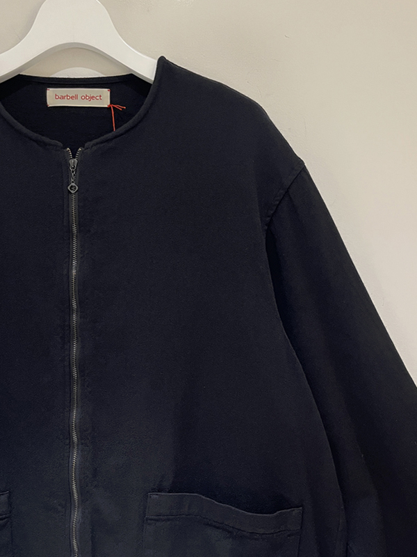 裏地無しの一枚仕立て、ノーカラー(襟なし)のすっきりした首周り、フロントはチェーンヘッドのジッパーが採用されています。