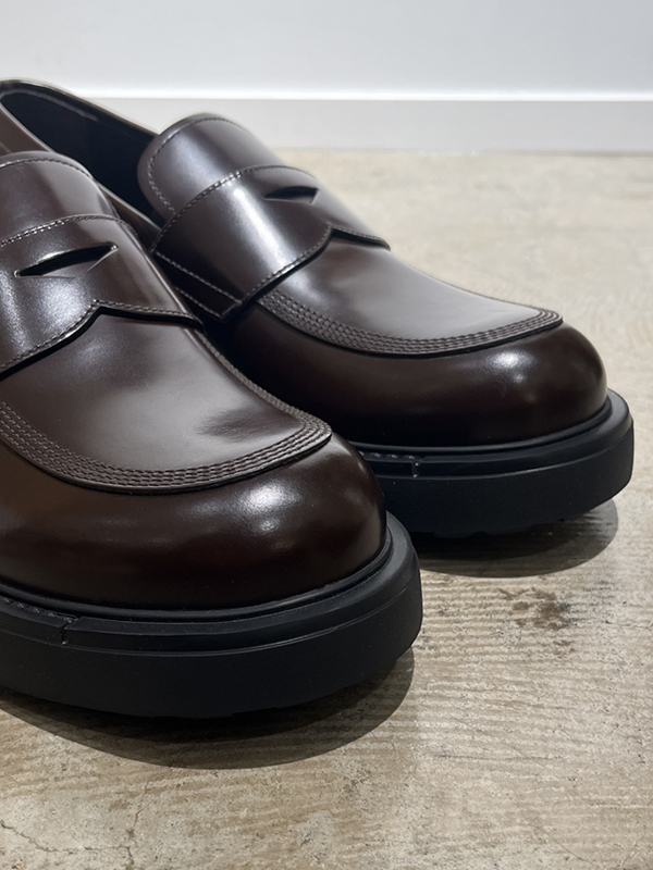 品のある佇まいにヴァンプ(つま先・甲部分)の4本ステッチや適度に厚み・ボリュームのある黒ラバーソールを合わせ、カジュアルなディテールが見事に融合しています。