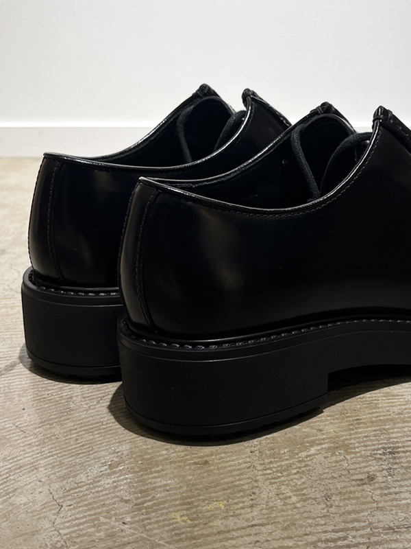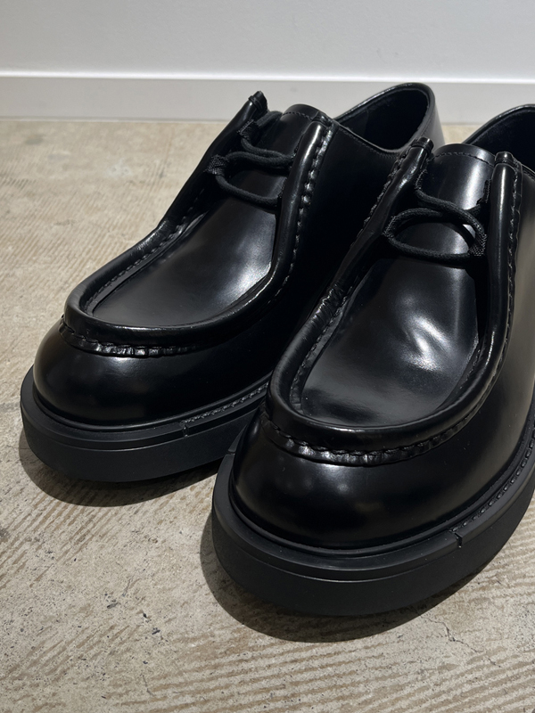 ボリュームのある黒ラバーソール、モカシンの特徴であるU字型ステッチにも高さを出して、レザーの上品さとカジュアルな仕様がバランスよくミックスされています。