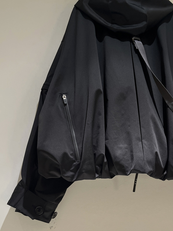 フードはスナップボタンにより着脱可能、背面にセンタープリーツ入り。