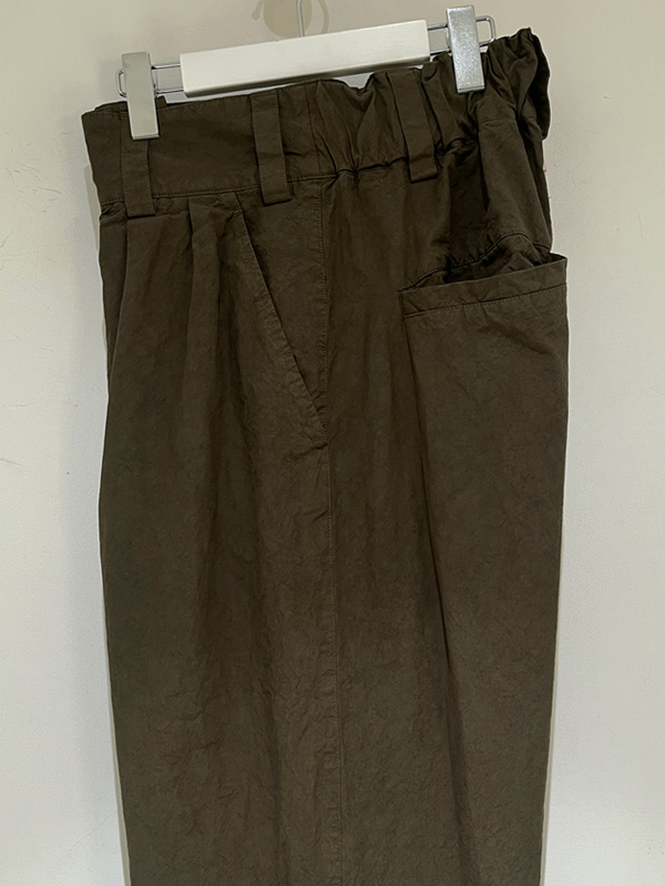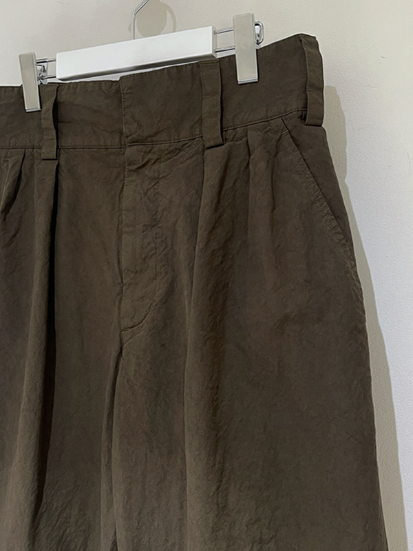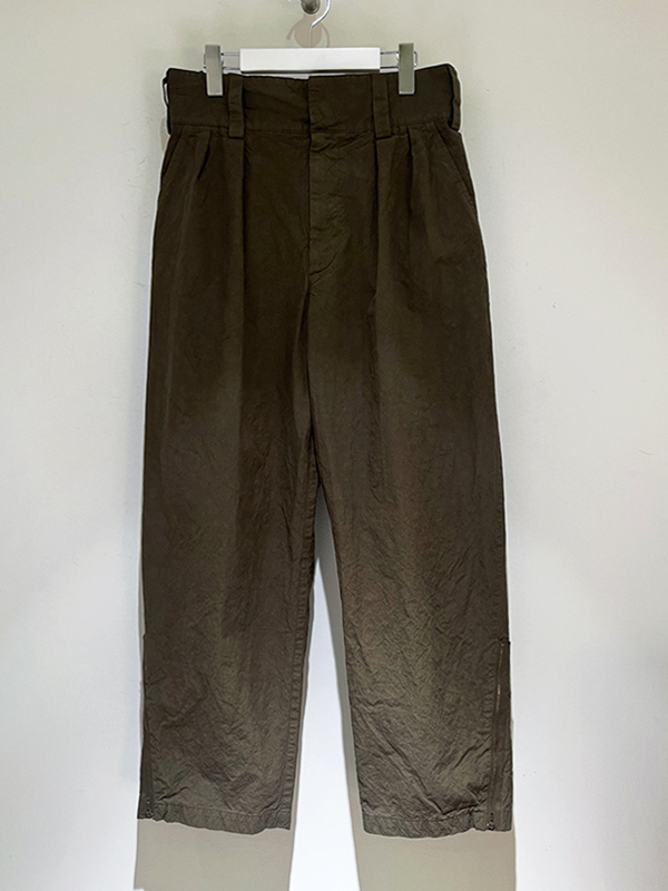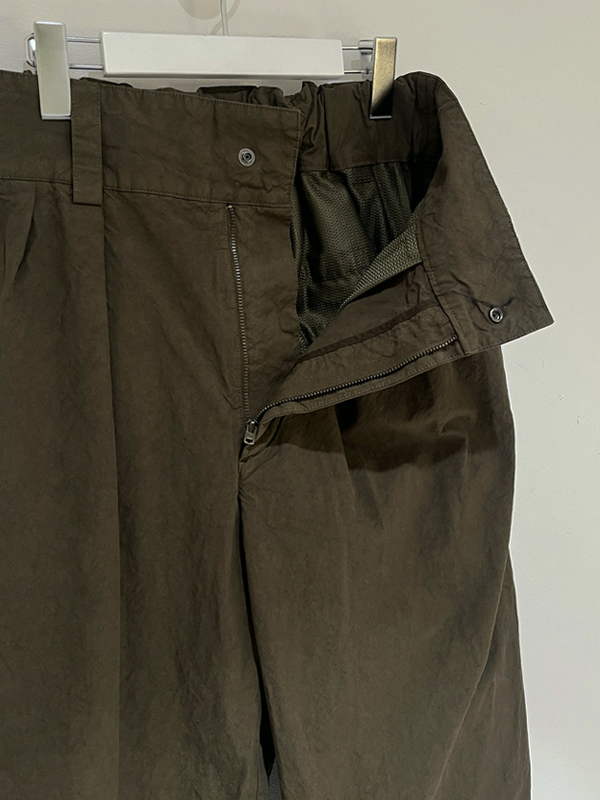 2タック仕様、股上深めでゆとりのあるシルエット、フロントはスナップボタン留め+ジッパーフライです。