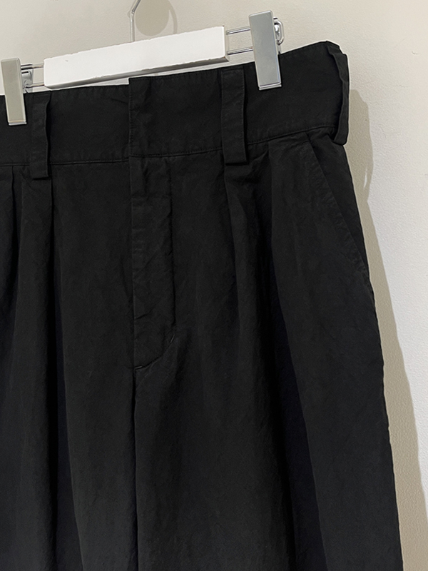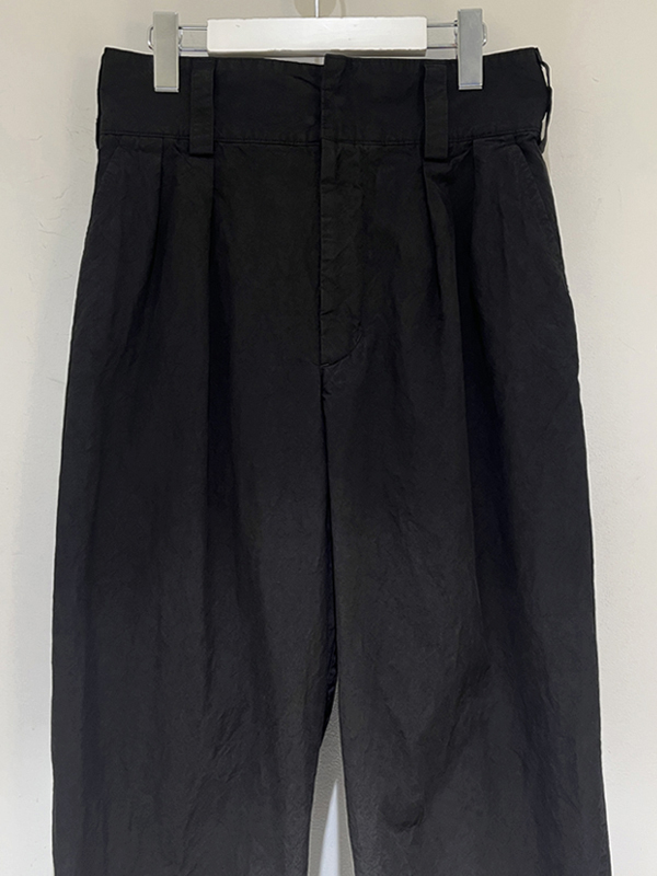 2タック仕様、股上深めでゆとりのあるシルエット、フロントはスナップボタン留め+ジッパーフライです。
